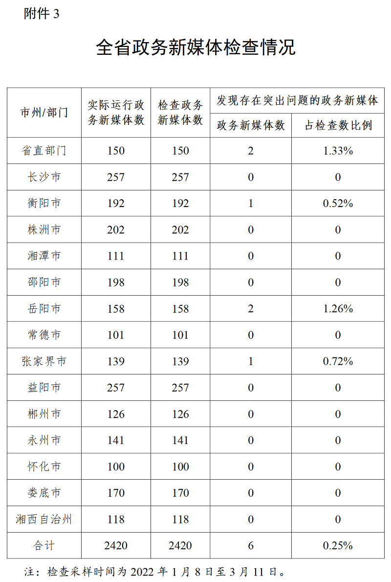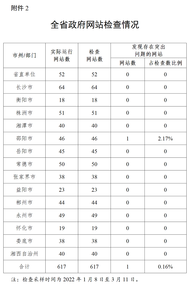 2022年第一季度,省政務局組織對全省正常運行的617家政府網站進行全覆蓋檢查,發現1家存在單項否決問題,總體合格率99.84%。重點檢查了全省136家政府門戶網站互動交流功能,共有61家政府門戶網站實現對簡單常見咨詢問題1個工作日內準確答復(詳見附件1)。對全省正常運行的2420家政務新媒體進行普查,發現6家存在突出問題,總體合格率99.75%。長沙市、株洲市、湘潭市、常德市、益陽市、郴州市、永州市、懷化市、婁底市、湘西自治州政府網站和政務新媒體檢查合格率均達到100%。