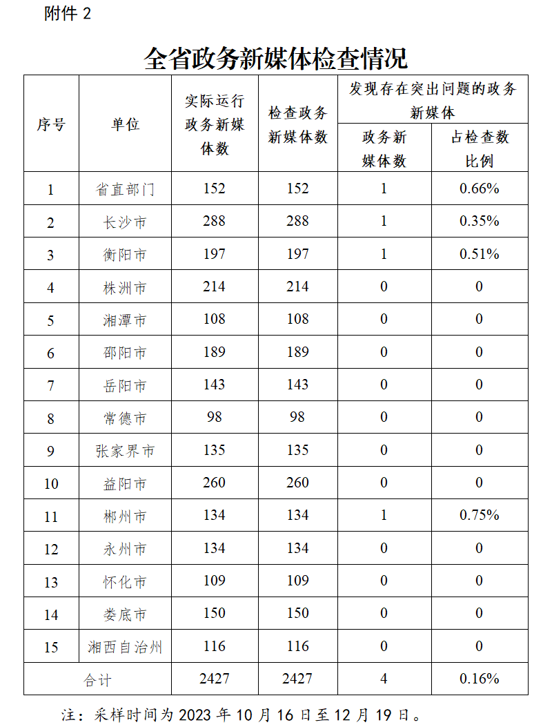株洲市、湘潭市、邵陽市、岳陽市、常德市、張家界市、益陽市、永州市、懷化市、婁底市、湘西自治州政務新媒體檢查合格率100%。
