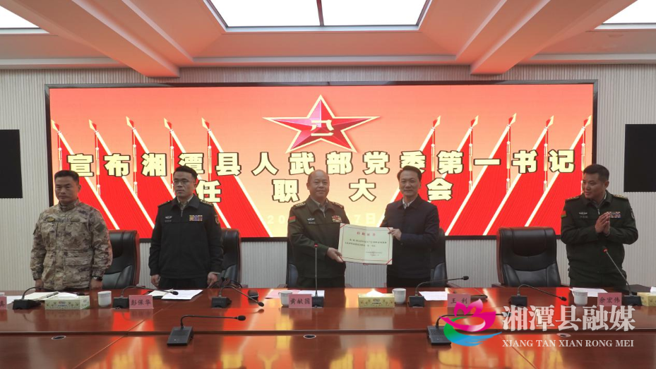 湘潭縣融媒體中心1月7日訊(記者 馬婧 陳嘉倫)1月7日,湘潭縣人武部黨委第一書記任職宣布大會在縣人武部會議室隆重召開。湘潭市委常委、軍分區大校政治委員黃獻國宣布任職批復,任命王利為湘潭縣人武部黨委第一書記,并頒發任職證書。縣委書記、新任人武部黨委第一書記王利出席會議并作表態發言,縣領導曾力真、余宏偉、王彩玉參加。