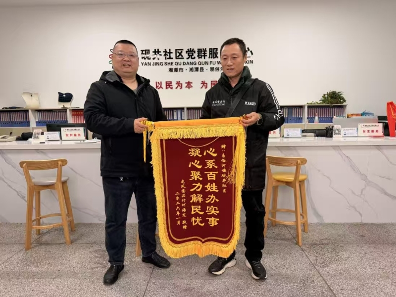 1月15日,易俗河鎮(zhèn)硯井社區(qū)茶香苑小區(qū)居民代表將一面寫著“心系百姓辦實事 凝心聚力解民憂”的錦旗送到社區(qū)黨群服務中心,衷心感謝社區(qū)與易俗河鎮(zhèn)文化綜合服務中心及時響應、快速修復因下水道錯位導致的路面坍塌問題,保障了居民出行安全。