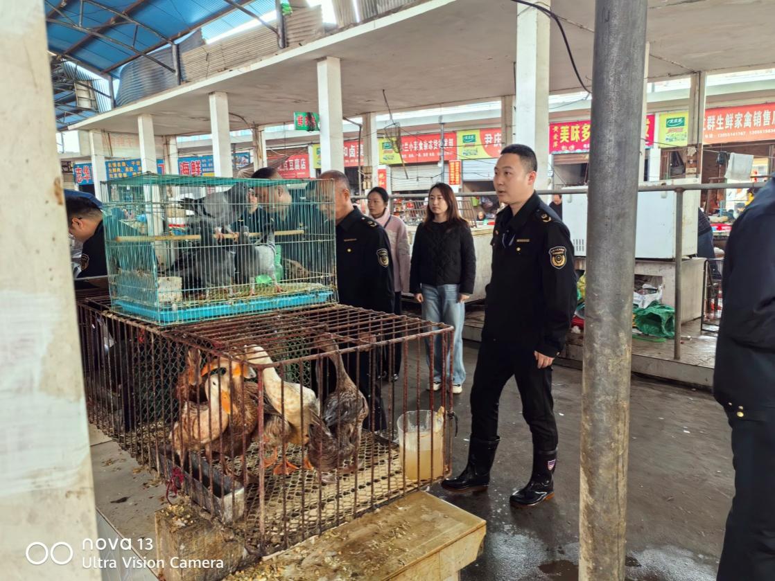 (圖為:執法人員在某農貿市場檢查現場)