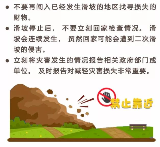 滑坡停止后,應繼續待在安全區域,避免受到連續發生滑坡二次遇險。