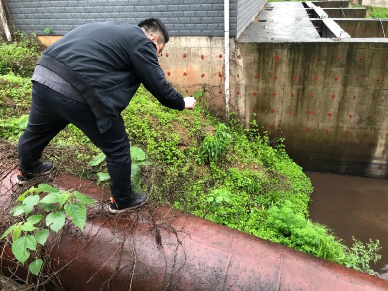 在現場,督察人員或涉水搜尋外排口,或攀上濕滑的排水管拍照取證,或遙控無人機查看重點區域。
