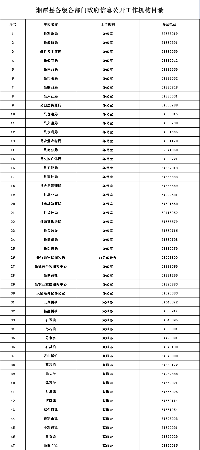 湘潭縣各級各部門政府信息公開工作機構目錄