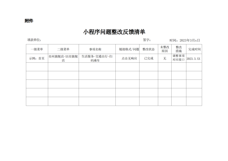 各相關單位要對照《問題清單》進行認真核查,于3月27日前,全面完成問題整改。接入“湘易辦”的服務頁面要全面采用https的安全協議,并正確配置小程序校驗文件,聯系“湘易辦”項目組進行驗證(小程序校驗文件,請在政務服務一體化平臺工作門戶下載)。各相關單位在問題核查整改中,若發現未在《問題清單》中列明的情況,請及時與工作人員反饋,共同定位問題、分析原因、確定整改措施,“湘易辦”項目組將動態更新《問題清單》。各單位完成問題整改后,要如實填寫《小程序問題整改反饋清單》(附件),并由本單位負責人簽字確認,于3月27日前將電子表格和加蓋公章的掃描件反饋至xtsdzzwglk@163.com郵箱。