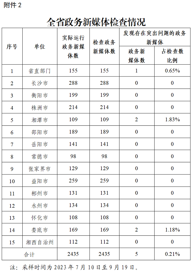 對全省正常運行的2435家政務新媒體進行普查,發現5家存在突出問題,總體合格率為99.79%。長沙市、衡陽市、株洲市、邵陽市、岳陽市、常德市、張家界市、益陽市、郴州市、永州市、懷化市、湘西自治州政務新媒體檢查合格率100%。