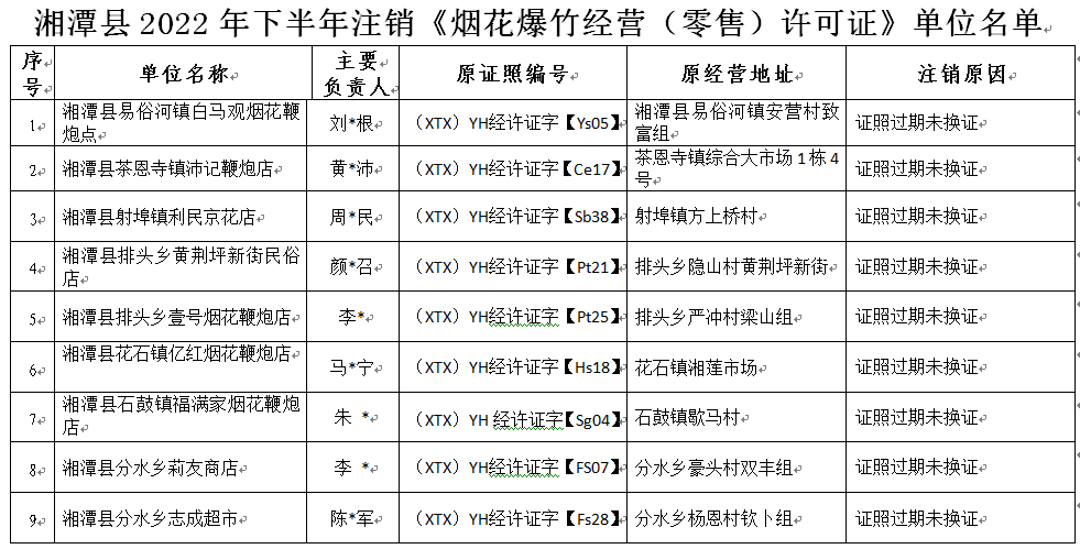 附件:湘潭縣2022年下半年注銷《煙花爆竹經營(零售)許可證》單位名單