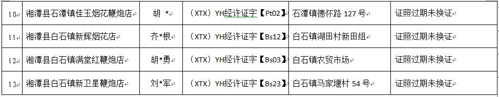 關于注銷湘潭縣易俗河鎮白馬觀煙花鞭炮點等13家經營單位《煙花爆竹經營(零售) 許可證》的公告