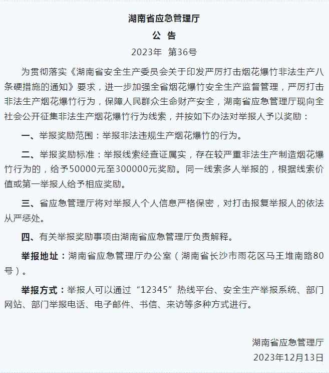 湘潭縣應急管理局轉發湖南省應急廳關于舉報非法生產煙花爆竹線索獎勵的公告