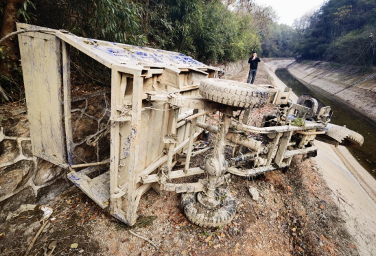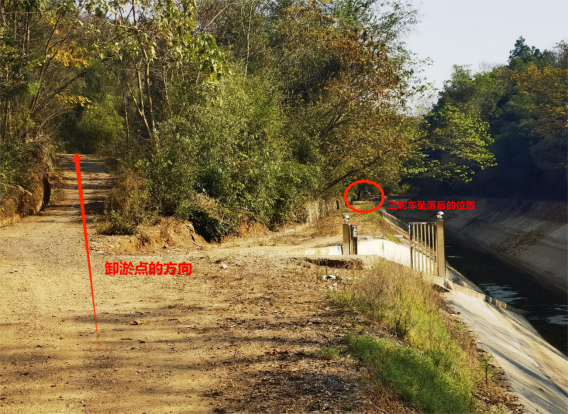 2023年11月29日7時許,文某云駕駛一臺無牌三輪摩托車,文某云兒子文某騎摩托車搭載其母親,三人前往石潭鎮**村南干渠坑山地段(K24+***-200)的渠道清淤。到達位置后,文某云將三輪摩托車停到渠道邊的渠堤非鋪裝道路上,三人開始清理渠道內的淤泥,用鏟子將河道里的淤泥鏟到文某云駕駛過來的三輪摩托車上。9時許,三人共計清理渠道一百余米。9時10分許,因三輪摩托車裝載的淤泥已滿,文某云駕駛三輪摩托車沿渠堤道路開往傾倒淤泥地點(圖1),其傾倒地點位于渠道東側山林的一處非鋪裝路面旁(圖2)。二十分鐘后,文某見文某云仍未返回,9時30分許多次撥打文某云電話無人接聽后騎摩托車沿文某云方向尋找,發現文某云的三輪車翻倒在渠道東側的渠堤上,文某云被壓倒在翻倒的三輪車下面,頭部出血,人處于昏迷狀態。