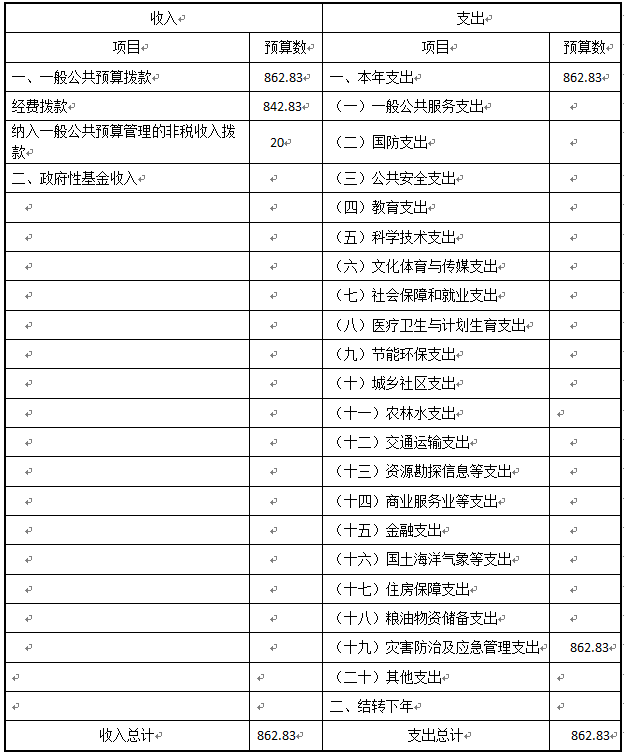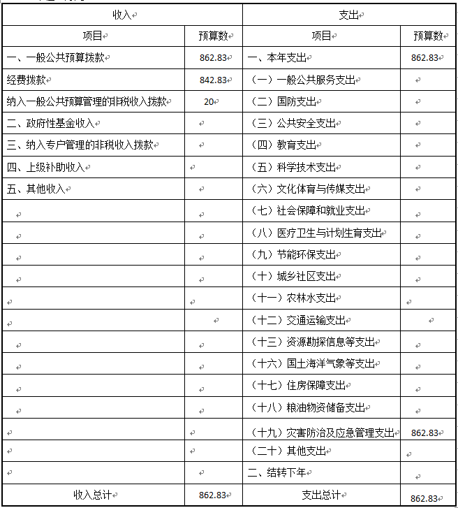 (一)收入預算:包括一般公共預算、政府性基金、國有資本經營預算等財政撥款收入,以及經營收入、事業收入等單位資金。2021年本部門收入預算862.83萬元,其中,一般公共預算撥款862.83萬元, 政府性基金預算撥款0萬元,國有資本經營預算撥款0萬元,納入專戶管理的非稅收入0萬元, 收入較去年預算增加257.42萬元,主要原因是一般公共預算撥款、項目支出的增加。