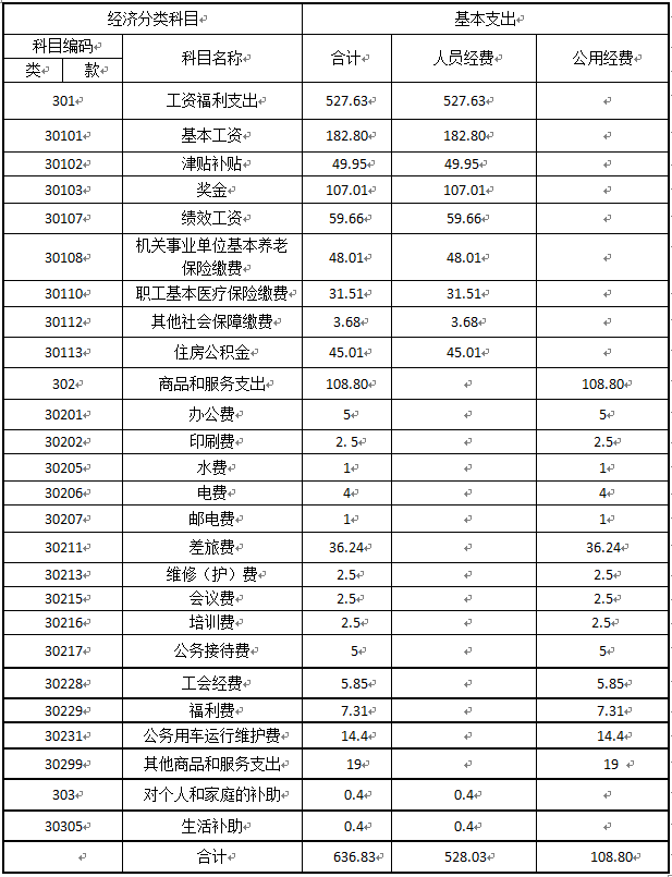 (一)基本支出:2021年本部門基本支出預算數636.83萬元。其中:人員支出527.63萬元,占基本支出的82.85%;一般商品和服務支出108.80萬元,占基本支出的17.08%;對個人和家庭的補助支出0.4萬元,占基本支出的0.07%。主要是為保障單位正常運轉、完成日常工作任務而發生的各項支出,包括用于基本工資、津貼補貼等人員經費以及辦公費、印刷費、水電費、辦公設備購置等日常公用經費。