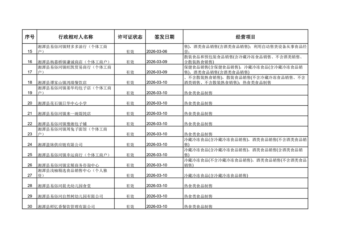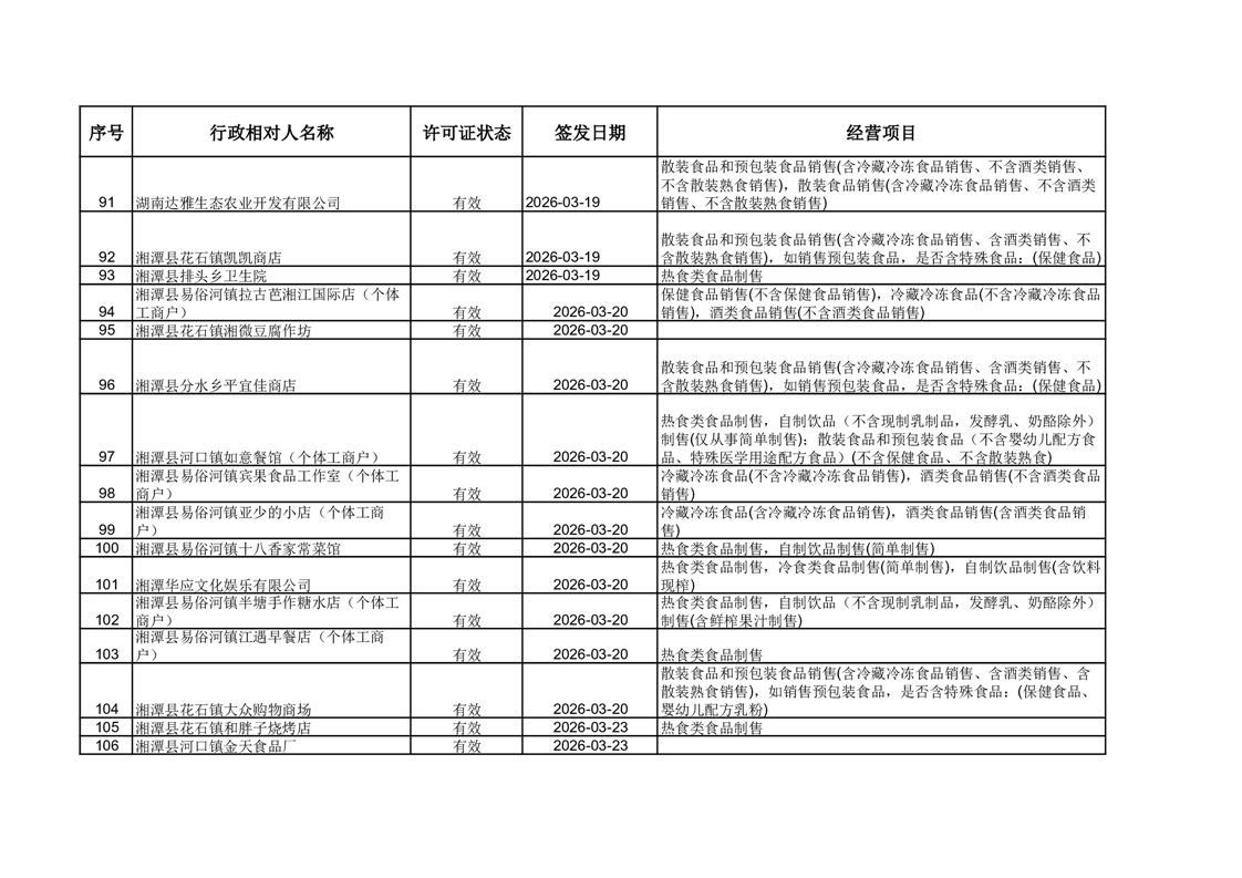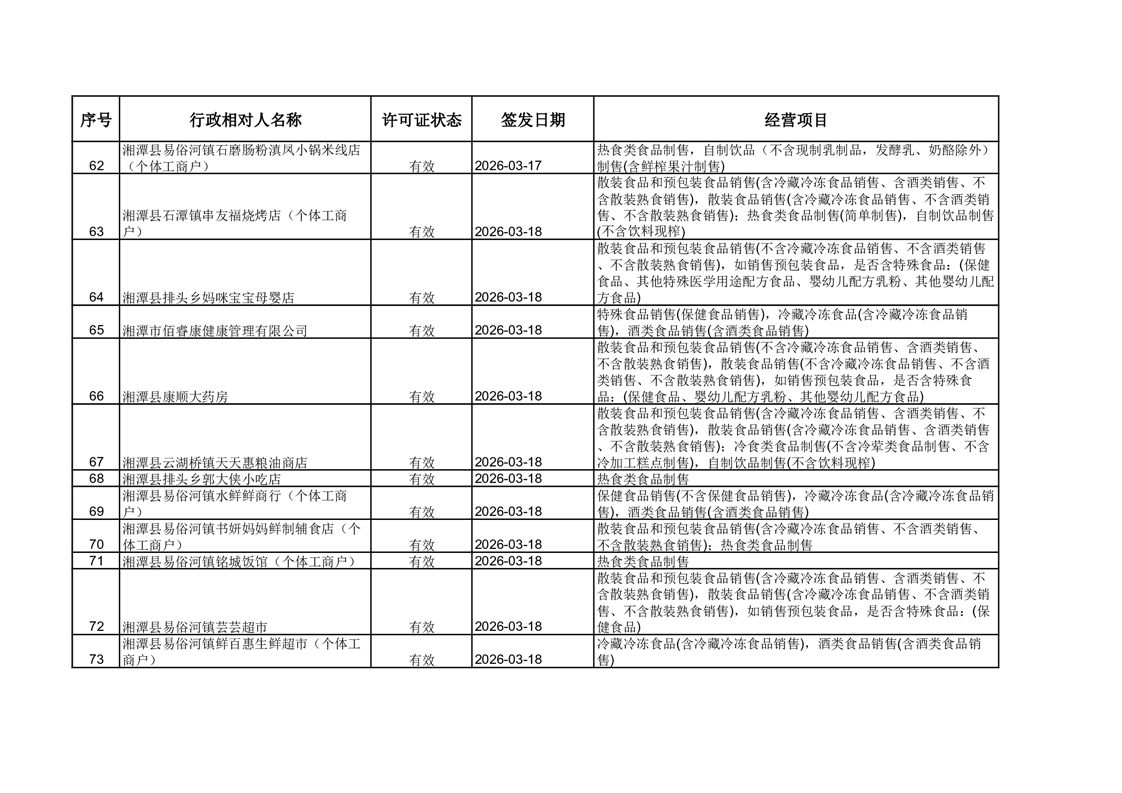 湘潭縣市場監督管理局2026年食品經營許可(2026.03.01-2026.03.31)