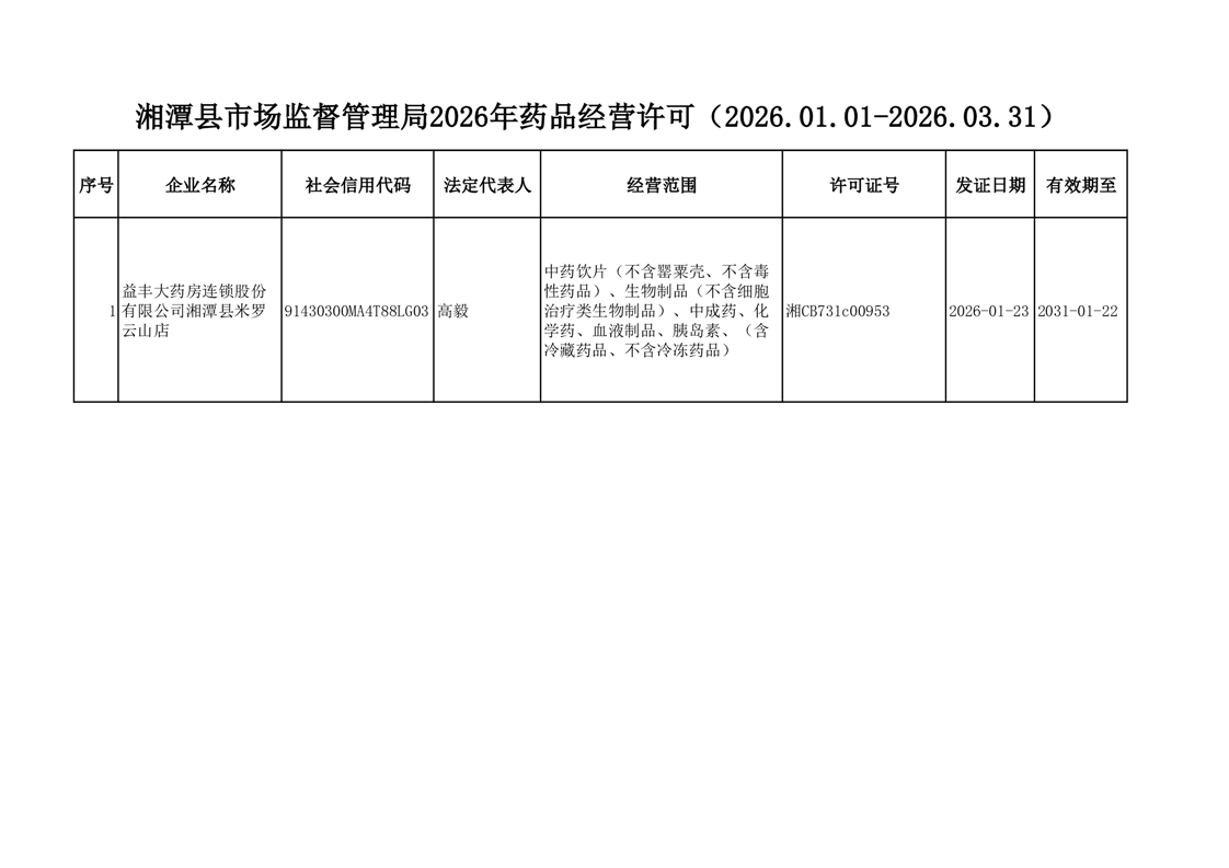 湘潭縣市場監督管理局2026年藥品經營許可(2026.01.01-2026.03.31)