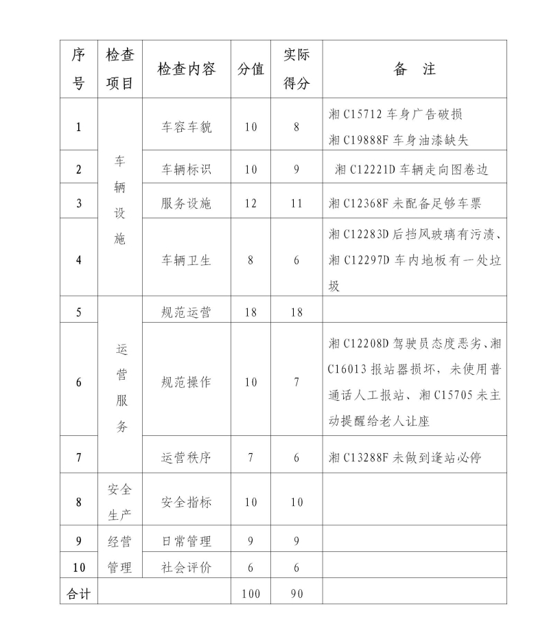根據《湘潭縣城市公交服務質量考核辦法(試行)》的規定,2024年1月份,我部門對湘潭縣公交進行了2023年第4季度的考核,現將考核成績公示如下: