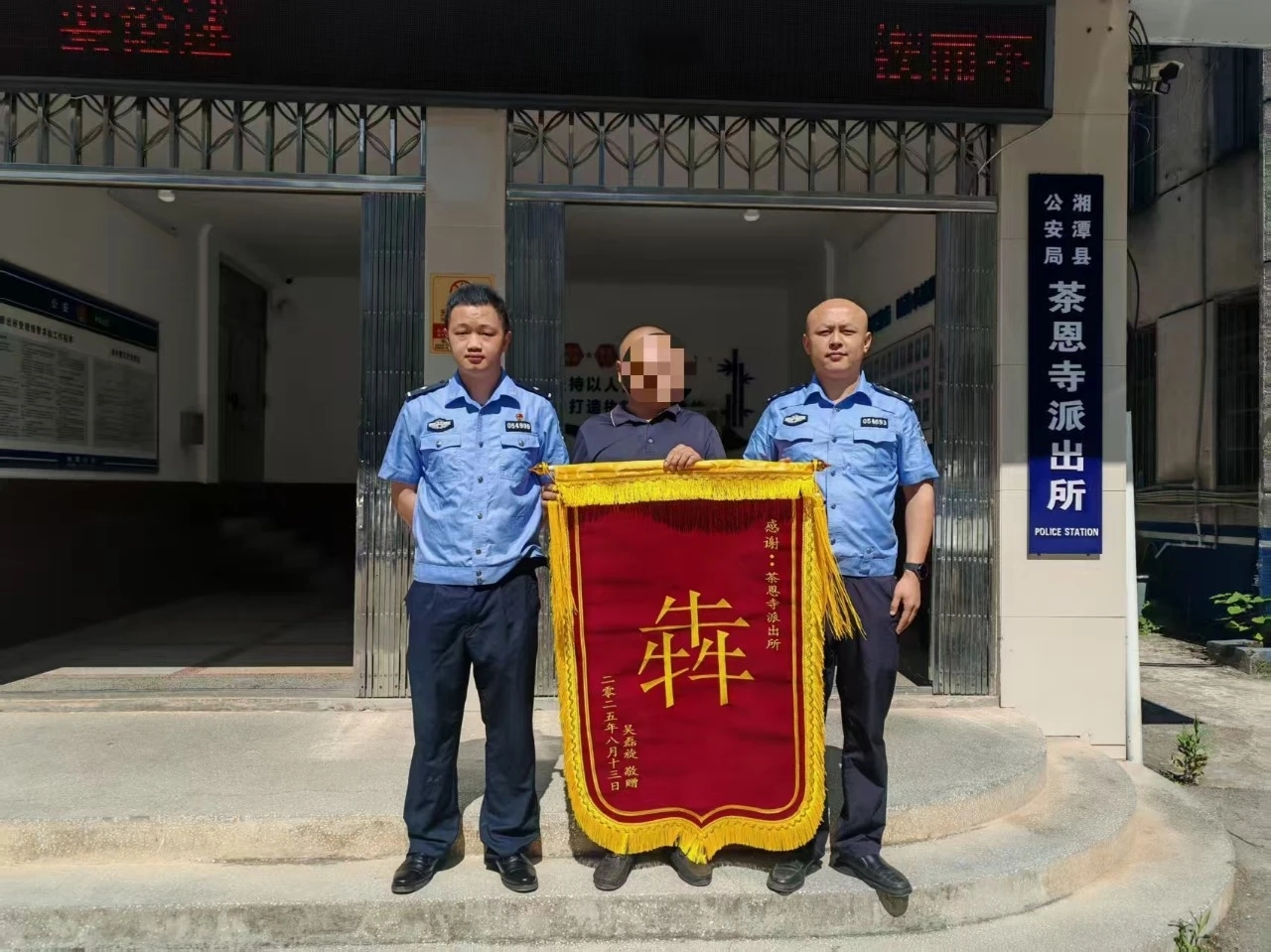 “太感謝你們了!錢追回來了,人也抓到了!”8月20日,湘潭縣茶恩寺鎮的吳先生帶著鞭炮和錦旗,專程來到茶恩寺派出所致謝——鞭炮聲里,一個大大的“犇”字錦旗格外亮眼。
