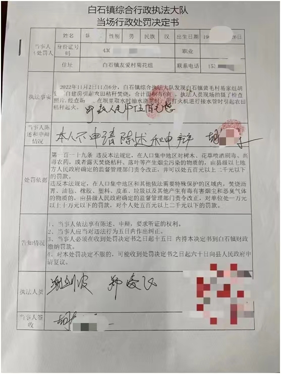湘潭縣白石鎮(zhèn)處罰兩起違法燃燒秸稈事件