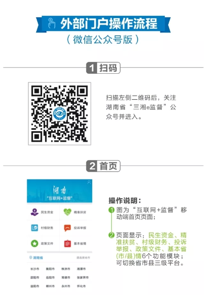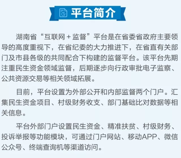 湖南省“互聯網+監督”平臺于2017年11月14日正式啟動上線,是省委、省政府為深化“雁過拔毛”式腐敗問題專項整治的一項創新舉措,該平臺圍繞“錢從哪里來,花到哪里去、干了什么事、效果怎么樣、有沒有問題”這條主線,將各類民生資金,特別是扶貧資金的撥付、發放和使用情況全面公開,實現對每筆資金從上至下、從部門到農戶到個人到項目的全程監督。群眾可通過平臺門戶網站、移動APP、“三湘e監督”微信公眾號等途徑,選擇所在市、縣、鎮、村名,輸入姓名或身份證號就可以查詢到政府發放的補貼款項、民生工程和扶貧項目的各種資金發放情況,足不出戶地對民生、扶貧資金使用、發放情況進行實時監督。